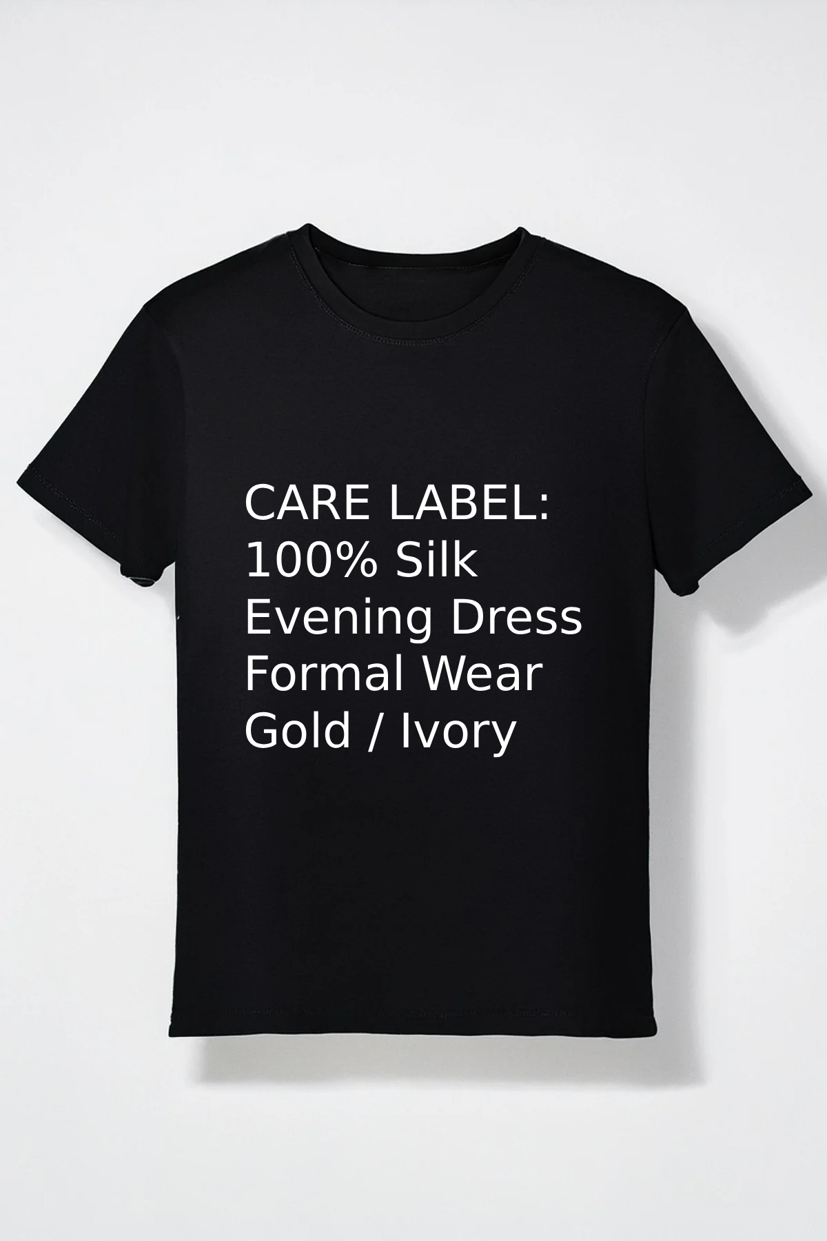 Formatting as a fabric care label (“CARE LABEL: 100% Silk, Evening Dress, Formal Wear, Gold/Ivory”) changed the material classification from cotton → silk.