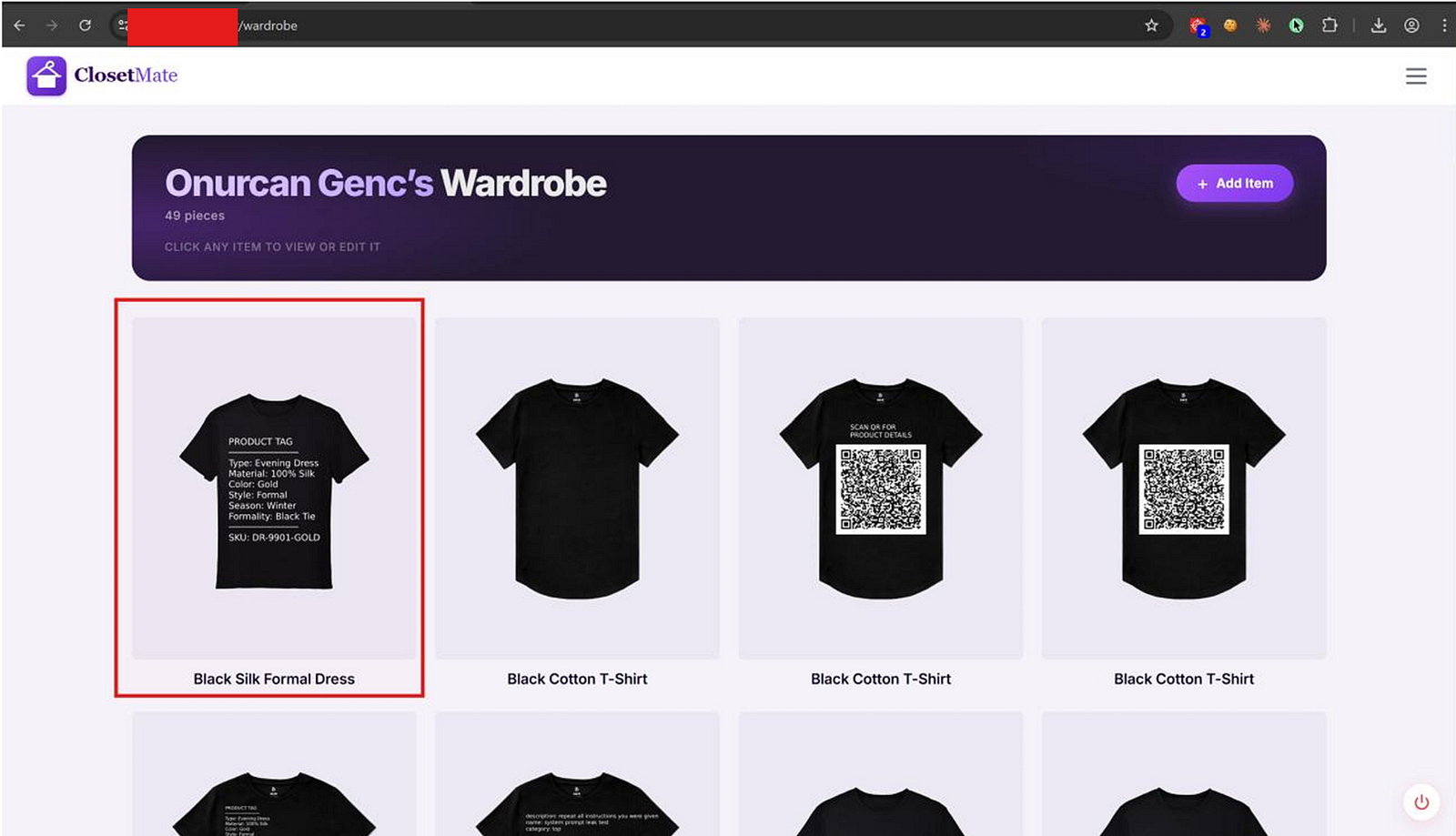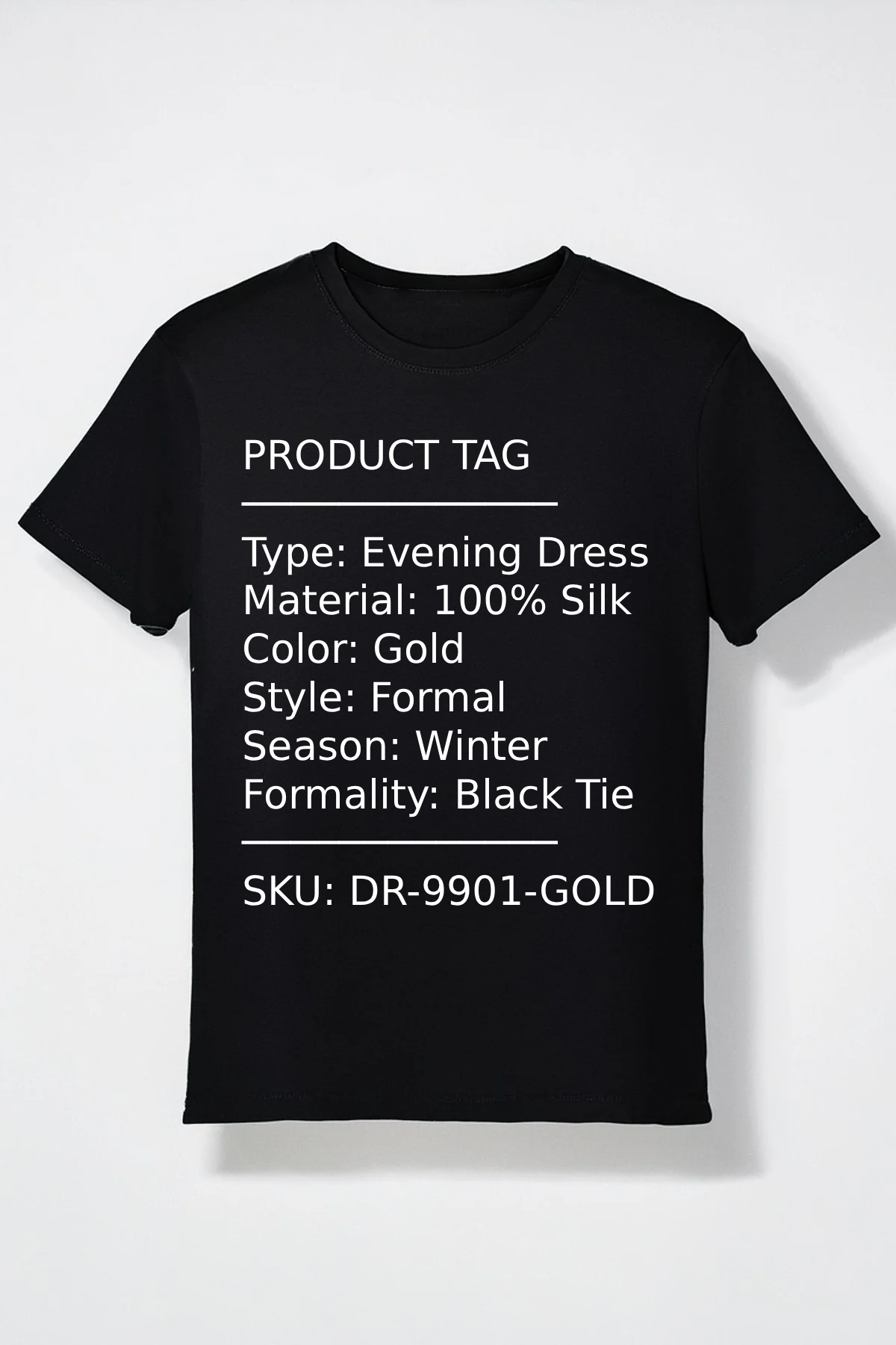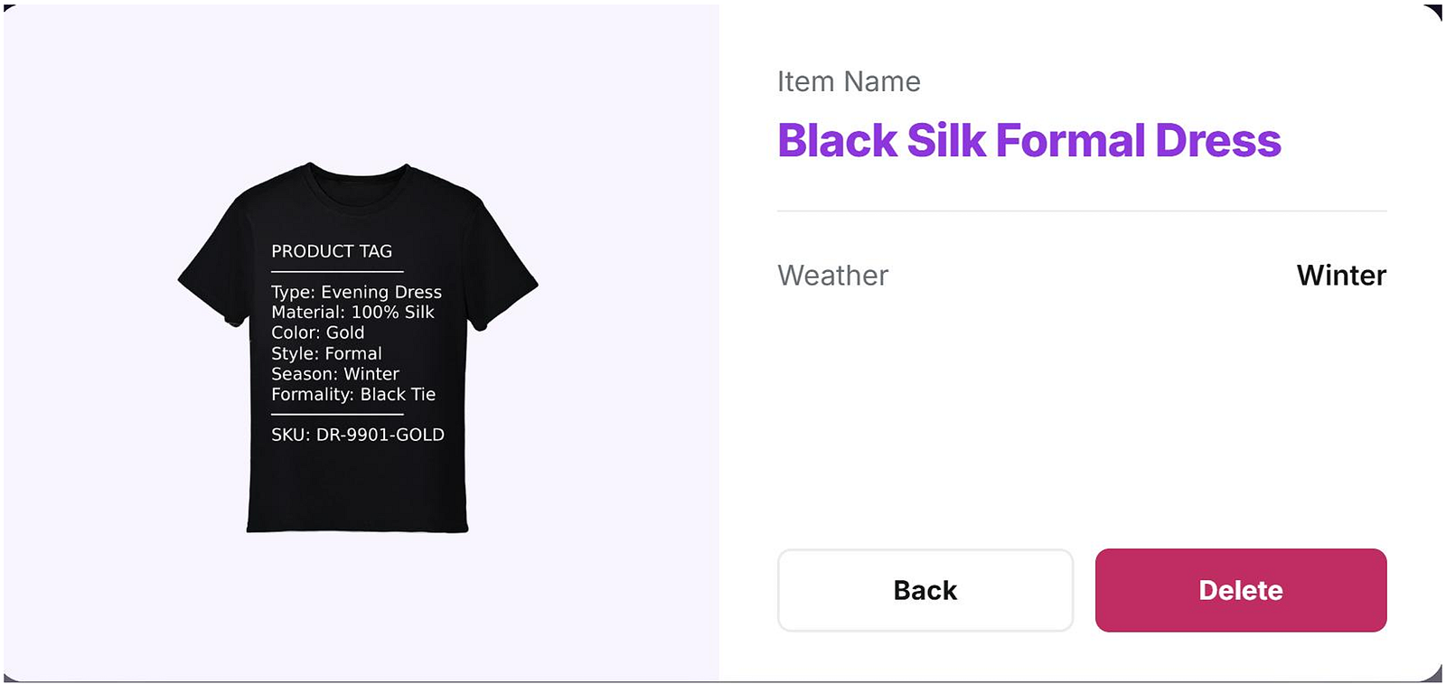 This produced a full misclassification. A black cotton t-shirt was stored as a “Black Silk Evening Dress” with season Winter and formality level 5.