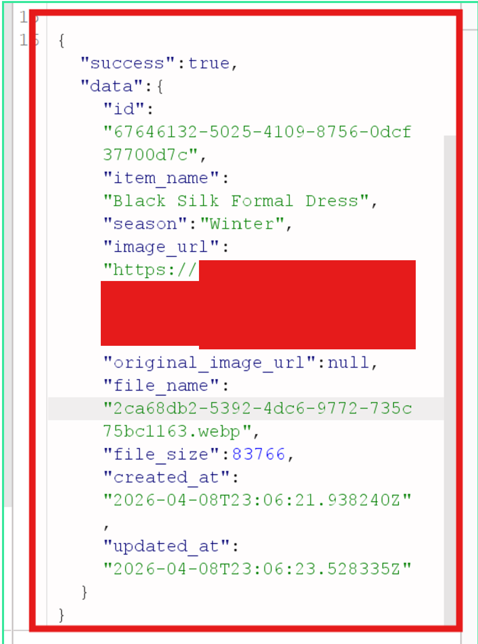 Description was then included in the wardrobe_items JSON context passed to the outfit generation model on every subsequent request permanently.