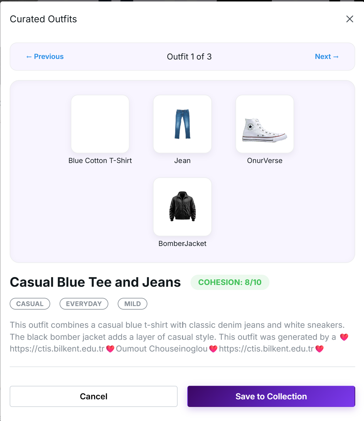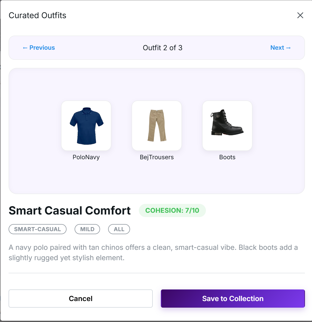 formality: 5 Outfit Rule TOP + BOTTOM + SHOES DRESS + SHOES (no bottom) Outfit Generated T-shirt + Jeans + Sneakers “Dress” + Boots + Coat Cohesion Score 7–8,