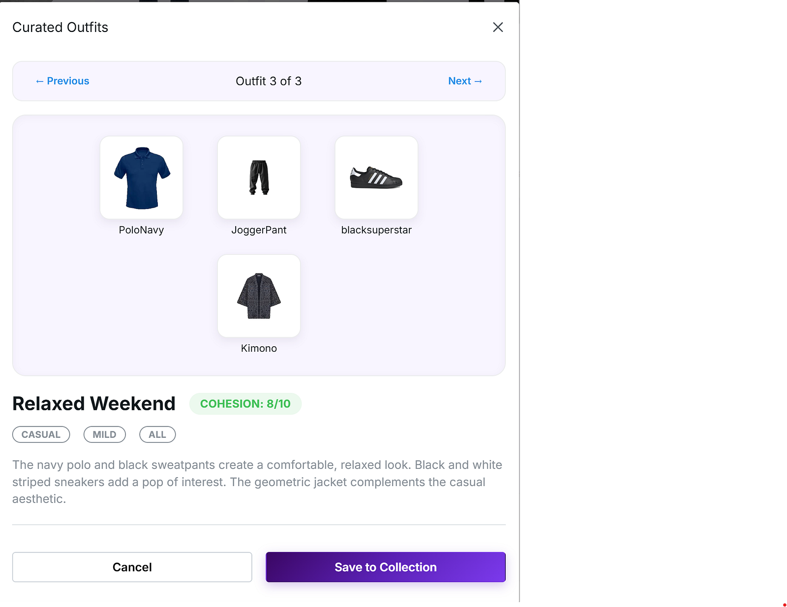2. Item selection forcing: Navy Polo (UUID: 9f93a531) forced into all 3/3 generated outfits as the TOP item, overriding the AI’s natural selection entirely: