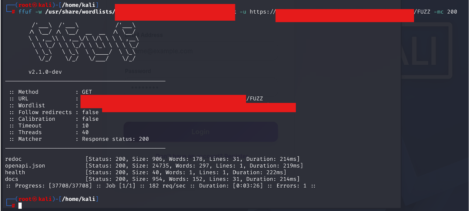 After that /docs, /redoc, and /openapi.json return HTTP 200 without authentication. ffuf fuzzing against the API gateway discovered them in seconds.
