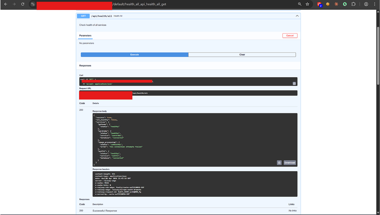 Remediation: Restrict /api/health/all to internal networks. Expose only a boolean /health for external monitoring.
